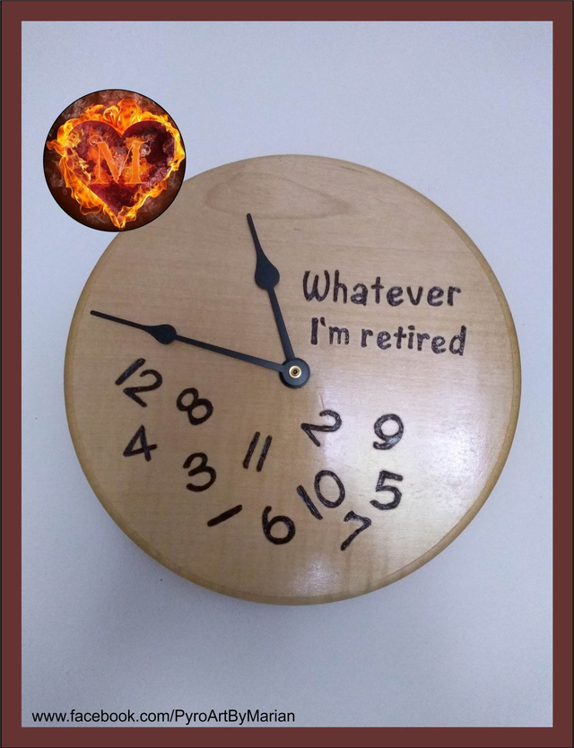 What a pleasure it would be to look at this clock and know you don't have to go to work that morning or any other! I made it and love putting it out at the market, it always makes me smile... being retired and all! It's great to see how many chuckles this one gets at the market! This would be a fun retirement gift from workmates, or just an amusing birthday gift when you reach that age. Hand drawn and pyrographed on beautiful smooth Sycamore. You won't find this piece on the High Street!